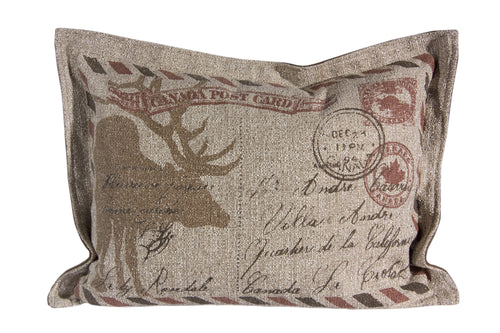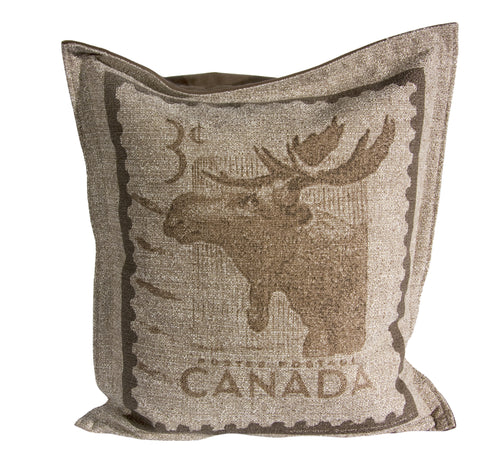 L961-MOOSE 20"x22" Pillow with Zippered Feather Insert the Moose Stamp printed Image with a Flanged edge part of the Lady Rosedale Vintage Canadiana Collection