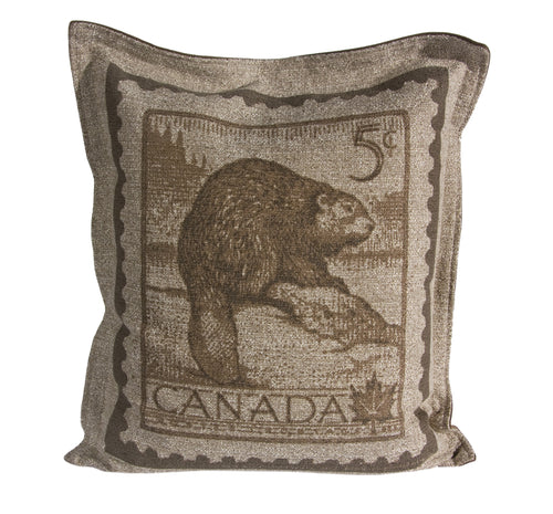 L961-BEAVR 20"x22" Pillow with Zippered Feather Insert the Beaver Stamp printed Image with a Flanged edge part of the Lady Rosedale Vintage Canadiana Collection