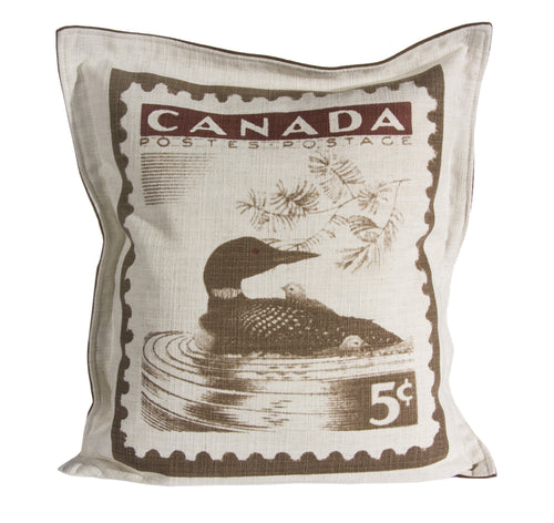 L961-LOON 20"x22" Pillow with Zippered Feather Insert the Loon Stamp printed Image with a Flanged edge part of the Lady Rosedale Vintage Canadiana Collection